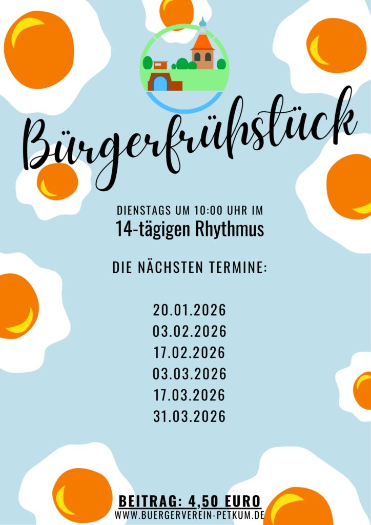 Im 14-tägigen Rhythmus findet unser Bürgerfrühstück statt, bei dem Dorfbewohnerinnen und Dorfbewohner bei einem gemütlichen Frühstück beisammen sein können. Jeder ist herzlich hierzu eingeladen. Der Kostenbeitrag beträgt 4,50 Euro pro Person.