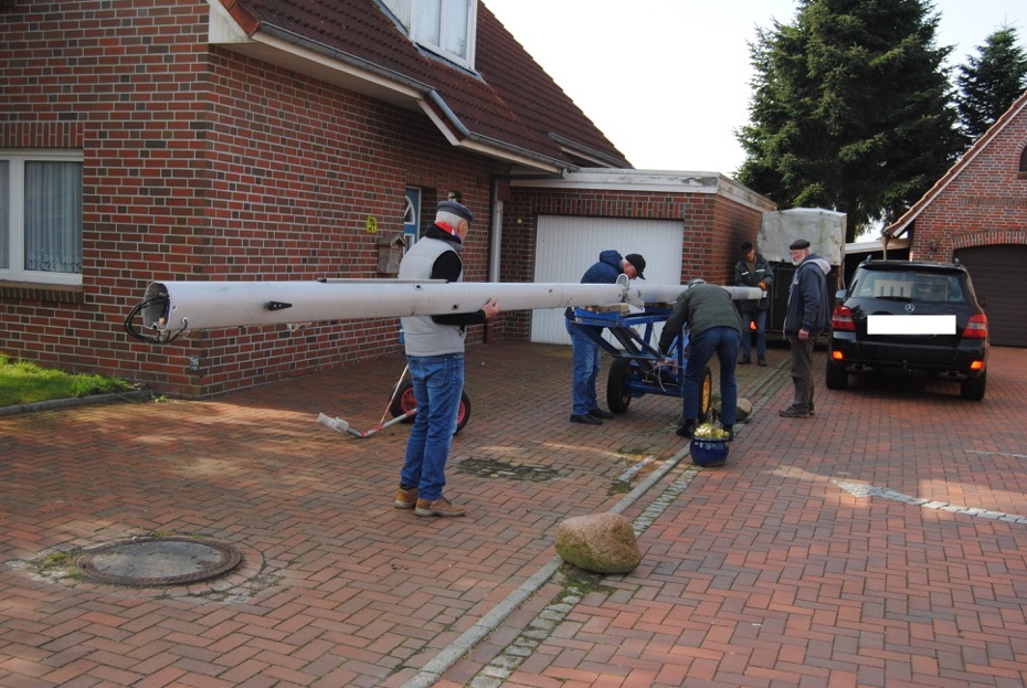 Da der alte Maibaum in die Jahre gekommen war, musste Ersatz her. Durch eine großzügige finanzielle Spende von Johann Siemers und Sonja Wonneberger aus Widdelswehr konnten wir einen ausrangierten Mast eines Segelbootes in Ditzum kaufen. Dieser wurde dann im Vorfeld von den Dorfkümmerern für seinen Einsatz vorbereitet.